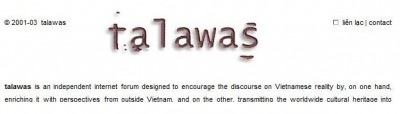 Quý vị và các bạn là những người làm nên talawas. Toàn bộ kho lưu trữ bài vở của Diễn đàn talawas 2001-2008, talawas blog 2009-2010, talawas chủ nhật và tạp chí talawas, được bảo quản và duy trì trên mạng, là tài sản chung của cộng đồng mạng chúng ta.