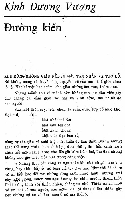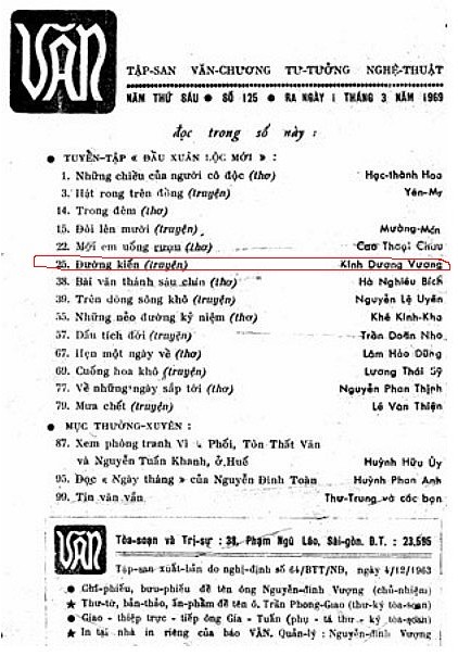 Hôm nay chúng tôi có nhận được từ nhà văn Trần Hoài Thư một bản chụp chính xác từng trang tạp chí VĂN số 125. Đây là trang 25 của số báo ấy, tức là trang đầu tiên của truyện “Đường kiến” của nhà văn Kinh Dương Vương.