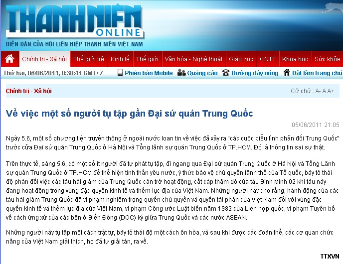 Dưới đây là nguyên văn bản tin của Thông Tấn Xã Việt Nam đăng trên báo Thanh Niên ngày 95.06.2011:
