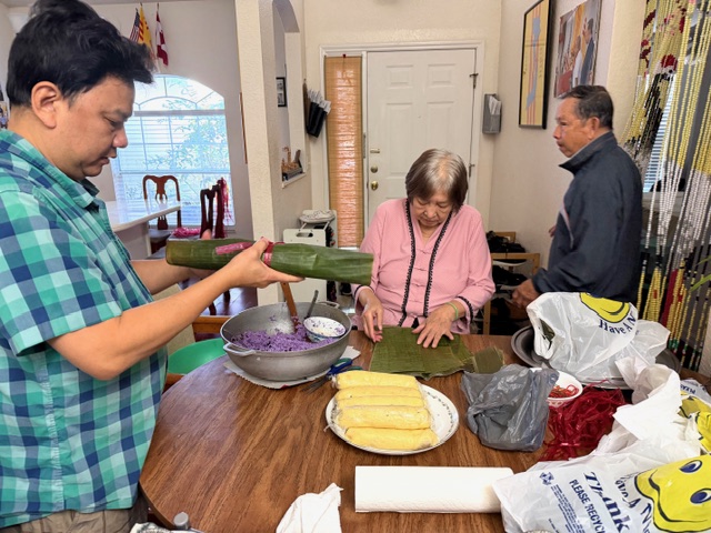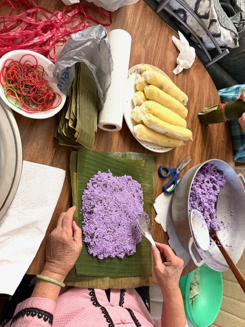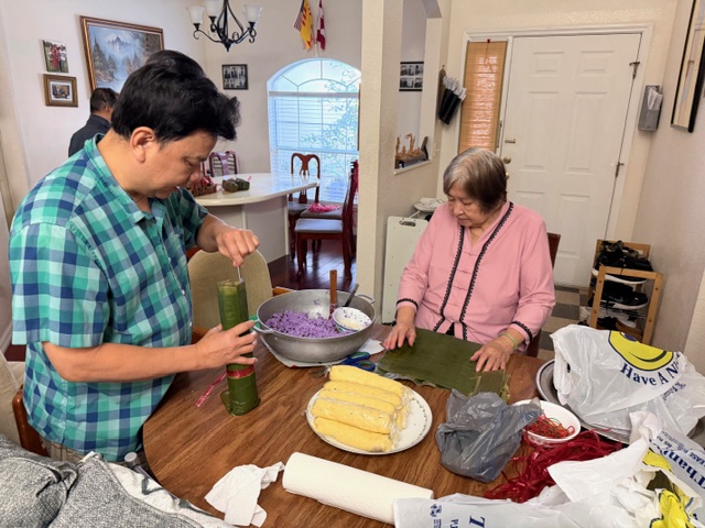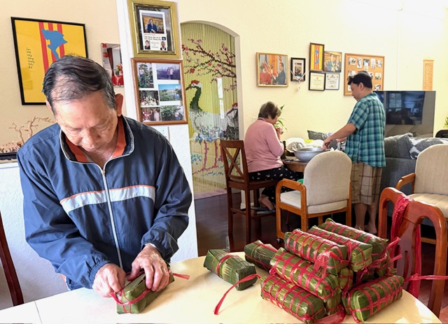 đôi vợ chồng của câu lạc bộ tự gói bánh tét truyền thống, tự dùng lá chuối trồng