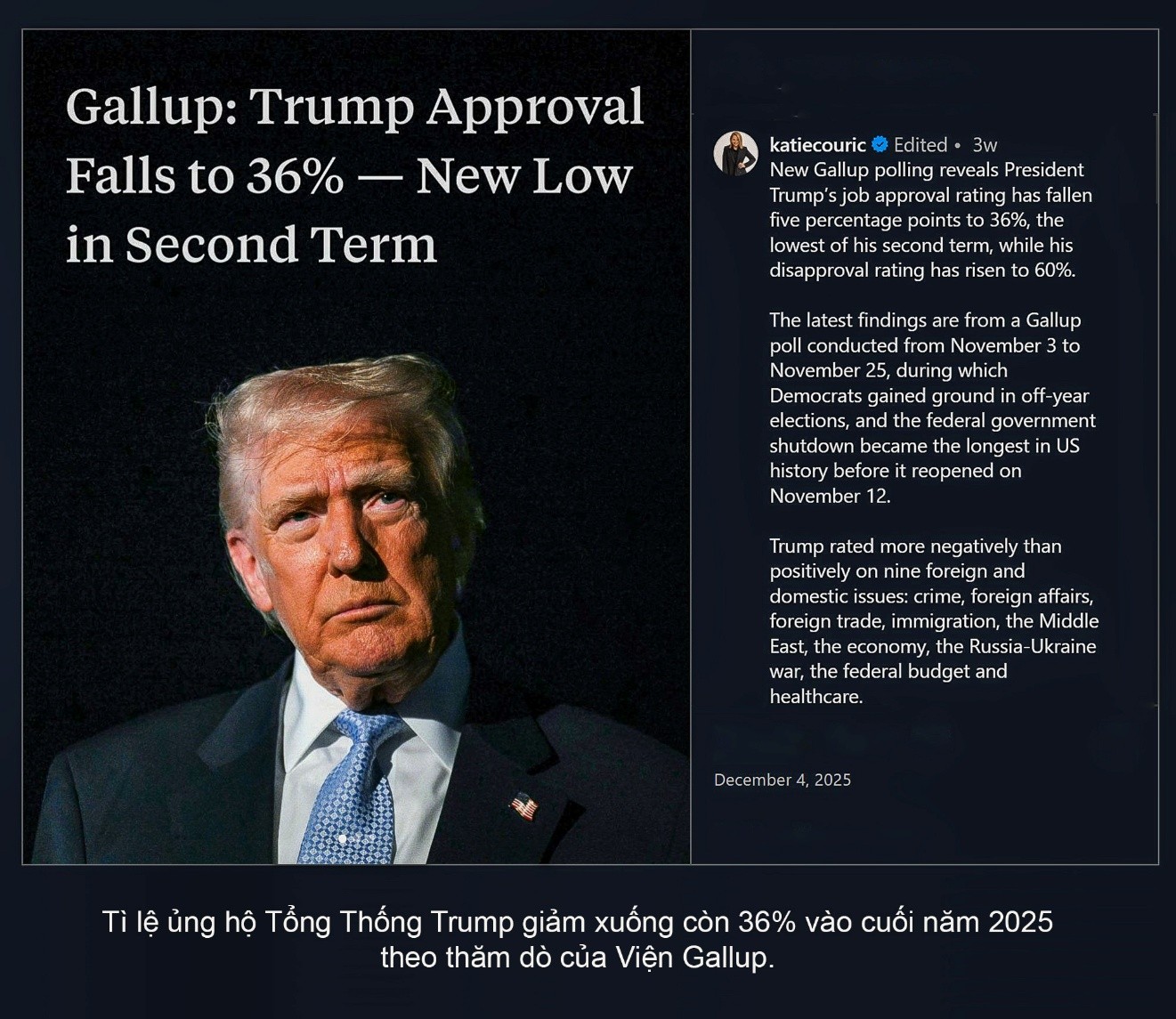 Tỷ lệ ủng hộ TT Trump giảm xuống còn 36% vào cuối năm 2025,