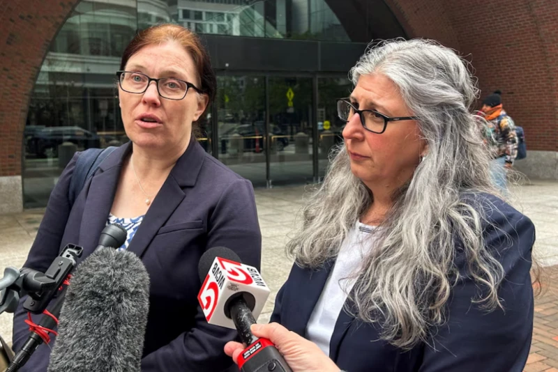Hai luật sư Anwen Hughes (trái) và Trina Realmuto phát biểu với các phóng viên bên ngoài tòa án liên bang tại thành phố Boston sau khi một thẩm phán phán quyết vào ngày 21/5/2025 rằng chính quyền Trump đã vi phạm lệnh của tòa án khi cố gắng trục xuất người nhập cư đến Nam Sudan