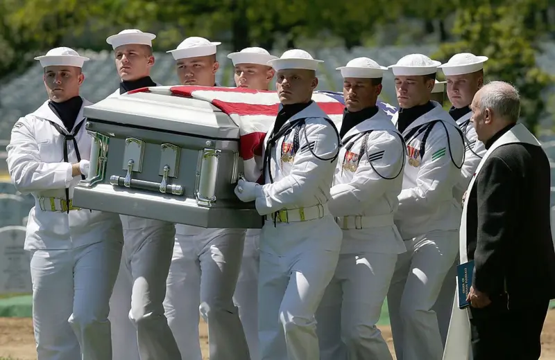 Hải quân Hoa Kỳ khiêng quan tài chứa hài cốt của thủy thủ mất tích sau vụ tai nạn trực thăng trong Chiến tranh Việt Nam vào tháng 7/1967, hình chụp tại Nghĩa trang Quốc gia Arlington, bang Virginia vào ngày 2/5/2013