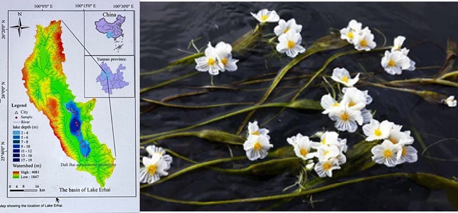 bản đồ lưu vực hồ Nhĩ Hải; (phải) hình ảnh hải thái hoa, một loài cây sống dưới