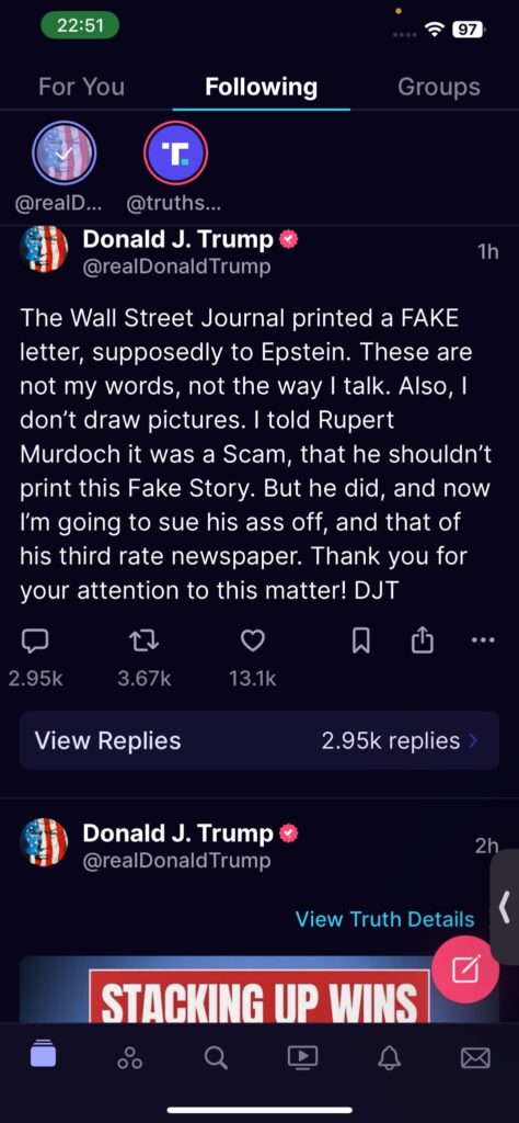 Trump lại dọa kiện Wall Street Journal vì đăng “thư giả” giữa tâm bão Epstein. Ông bảo, đã cảnh báo Murdoch, bảo đã thắng mấy vụ kiện báo chí trước, giờ sẵn sàng “xử” Wall Street Journal tiếp. Vụ thư này thật hay giả, chưa biết, nhưng mọi người hãy sẵn sàng chờ đón một tấn tuồng giật gân vào sáng ngày mai trên Wall Street Journal.