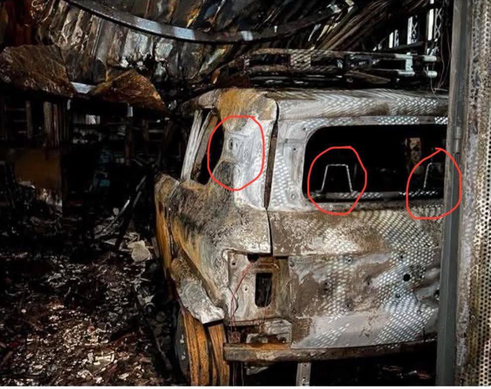 là một chiếc xe bị cháy trơ khung, trông khá giống một loại xe điện đang được
