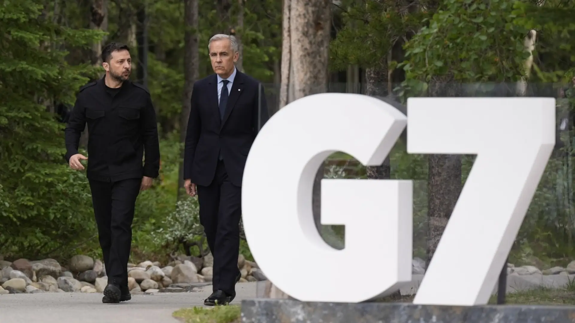 Thủ tướng Mark Carney cùng Tổng thống Ukraine Volodymyr Zelenskyy đi đến một phiên họp tại Hội nghị Thượng đỉnh G7 ở Kananaskis, Alberta, hôm thứ Ba, ngày 17 tháng 6 năm 2025. Ảnh: THE CANADIAN PRESS/Adrian Wyld