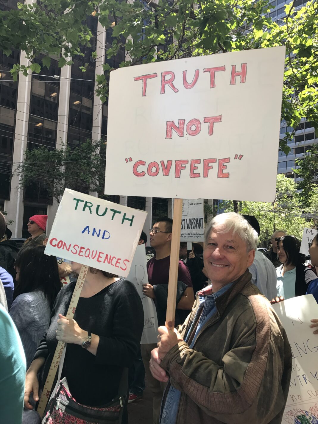 giáo sư cầm bảng hiệu: Truth Not “Covfefe” năm 2017. Nguồn: Wiki