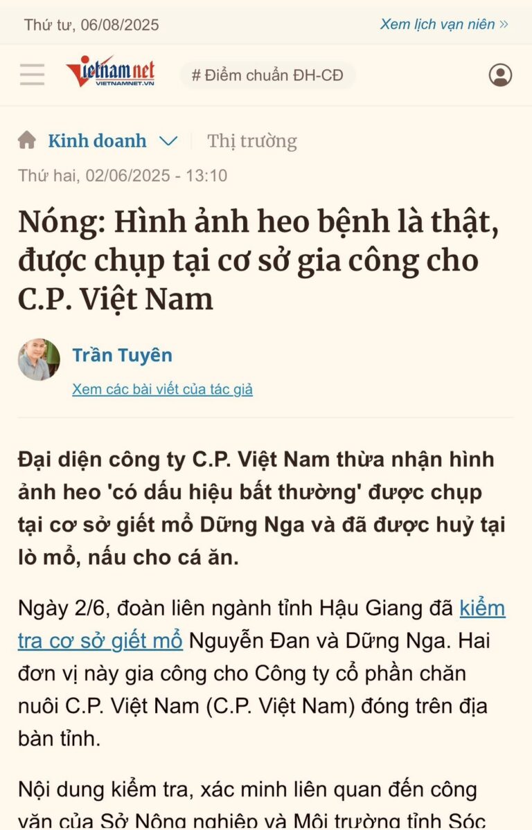 ngày 02/6/2025 như sau: “Đại diện công ty C.P. Việt Nam thừa nhận hình ảnh heo