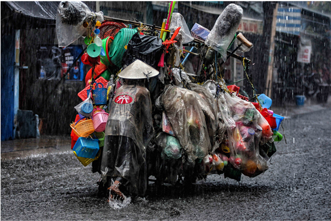minh họa: Một người phụ nữ với chiếc xe chất đầy hàng hóa, đẩy đi bán trong cơn
