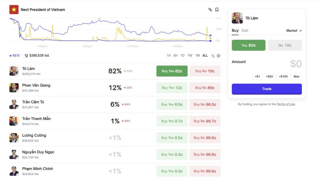 chụp màn hình kết quả ở thị trường cá cược chức Tổng Bí thư trên Polymarket