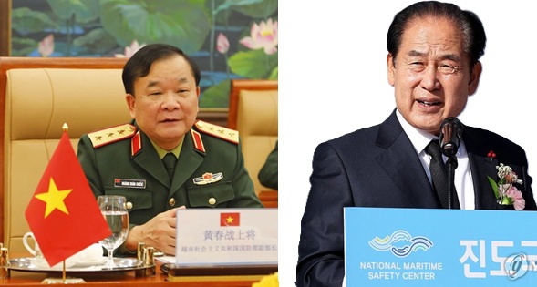 Thượng tướng Hoàng Xuân Chiến (trái) tại buổi tiếp đại sứ TQ và ông Kim Hee Soo, chủ tịch huyện Jindo, tỉnh Jeolla Nam, Hàn Quốc. Nguồn: QĐND và Yonhap. Tiếng Dân edit