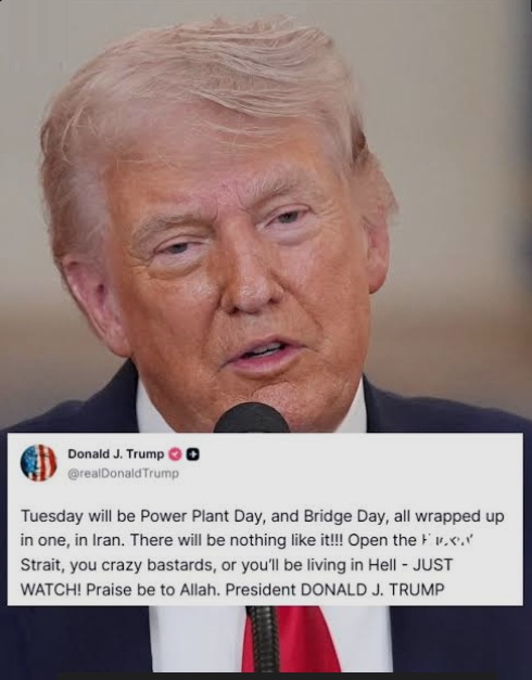 Ông viết: "Thứ Ba tới tại Iran sẽ là Ngày của những Nhà máy điện và Ngày của những cây cầu, tất cả gói gọn trong một. Sẽ chưa từng có tiền lệ!!! Mở cái eo biển chết tiệt đó ra ngay, lũ khốn điên rồ kia, bằng không các người sẽ phải sống trong địa ngục — CỨ CHỜ ĐẤY MÀ XEM! Thánh Allah phù hộ các người. Tổng thống DONALD J. TRUMP"